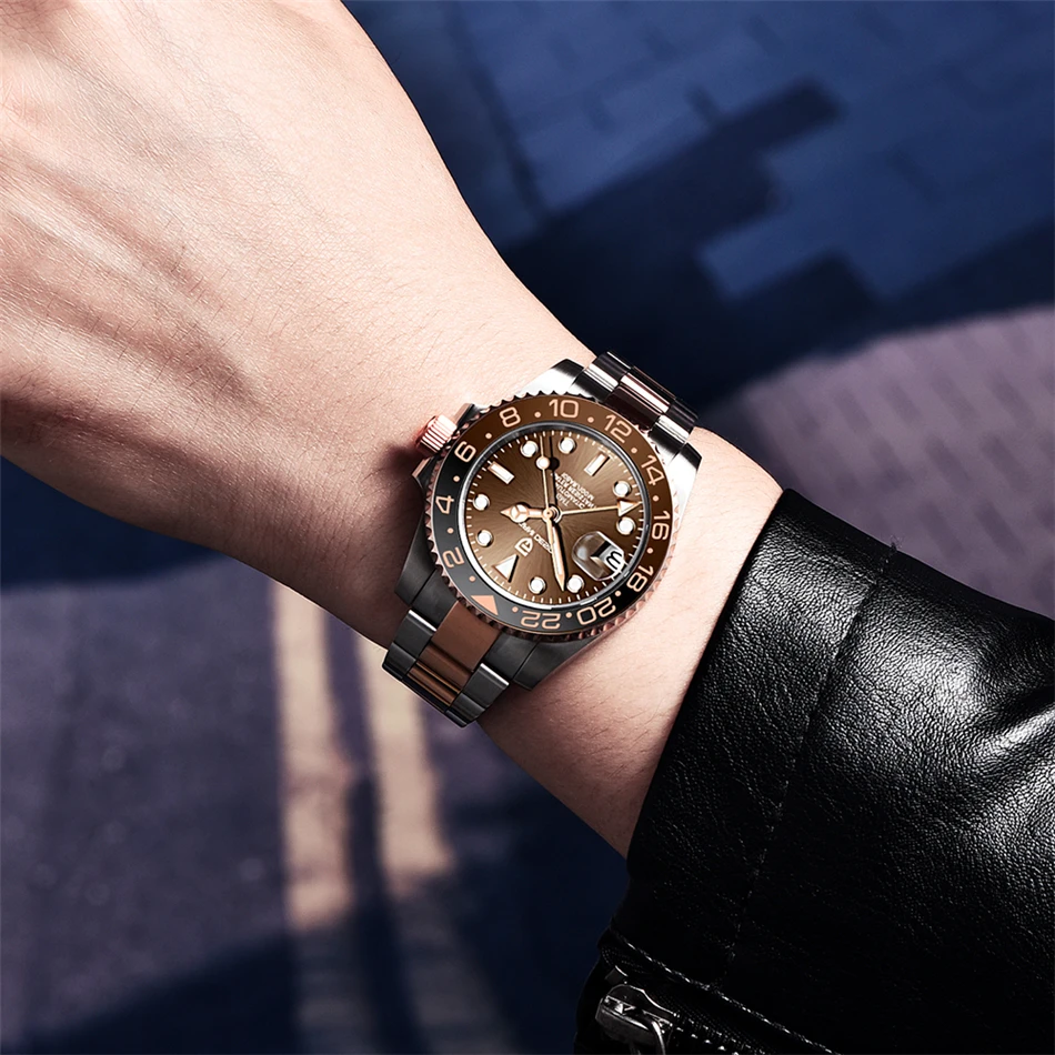 Funktionen: Stoßfest, automatisches Datum, Vollkalender, Taucheruhr, Mehrzeitzonenanzeige, Leuchtzeiger, wasserdicht